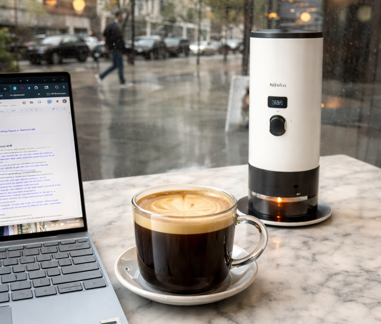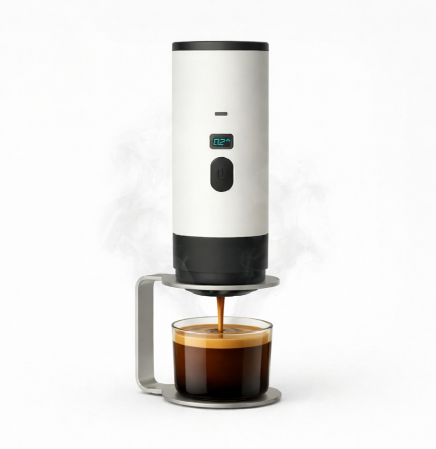 Ein kompakter, tragbarer Kaffeezubereiter, der per Knopfdruck frischen Kaffee direkt in die Tasse brüht.